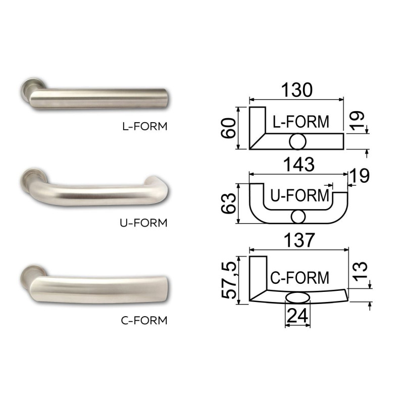 Szabványos „C-FORM” kilincs alapesetben – igény esetén L-FORM vagy U-FORM kivitelben is (kérjük, rendeléskor a megjegyzésben jelezze).