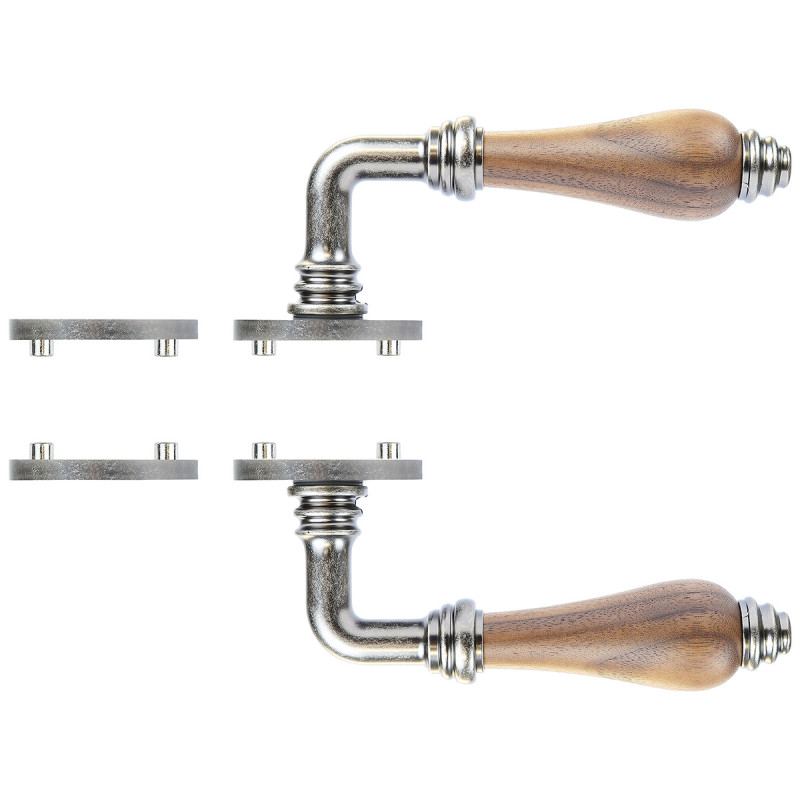 Felület: antik ezüst (AS) és natúr fa – fekete dió (a természetes fa mintázata és színe mindig egyedi, a kilincsek közti árnyalatnyi vagy mintázatban való eltérés nem reklamáció alap )