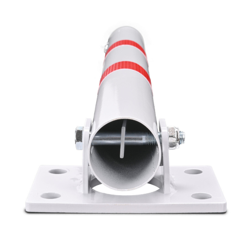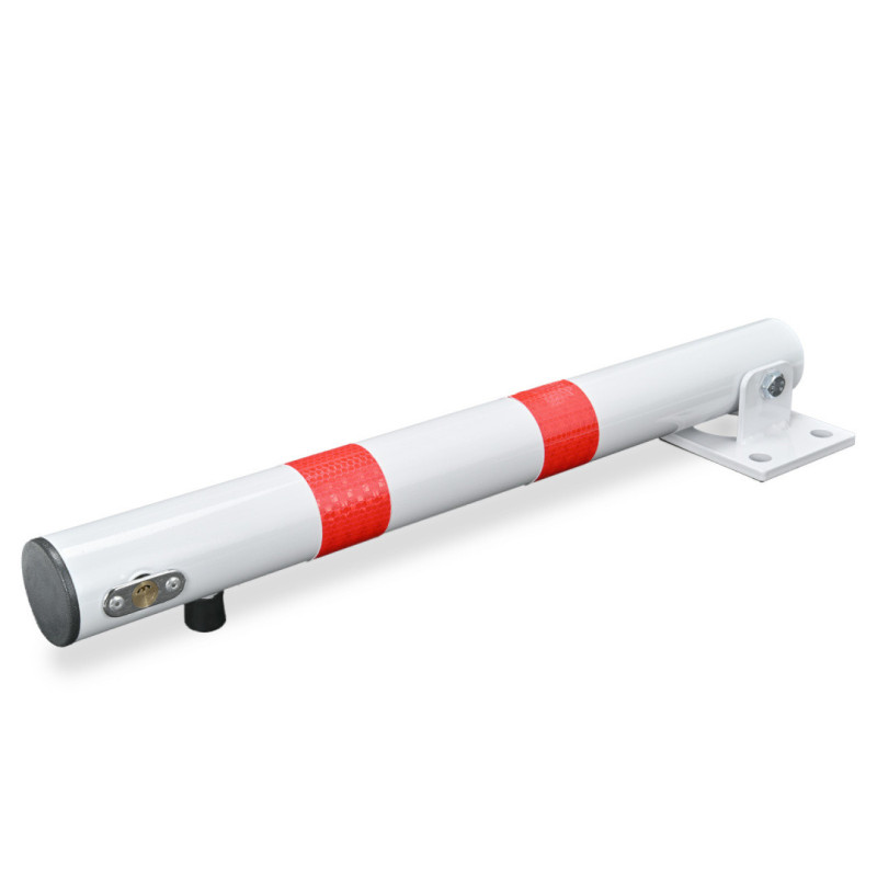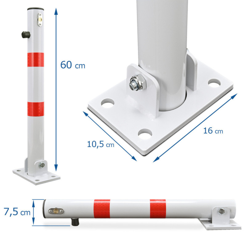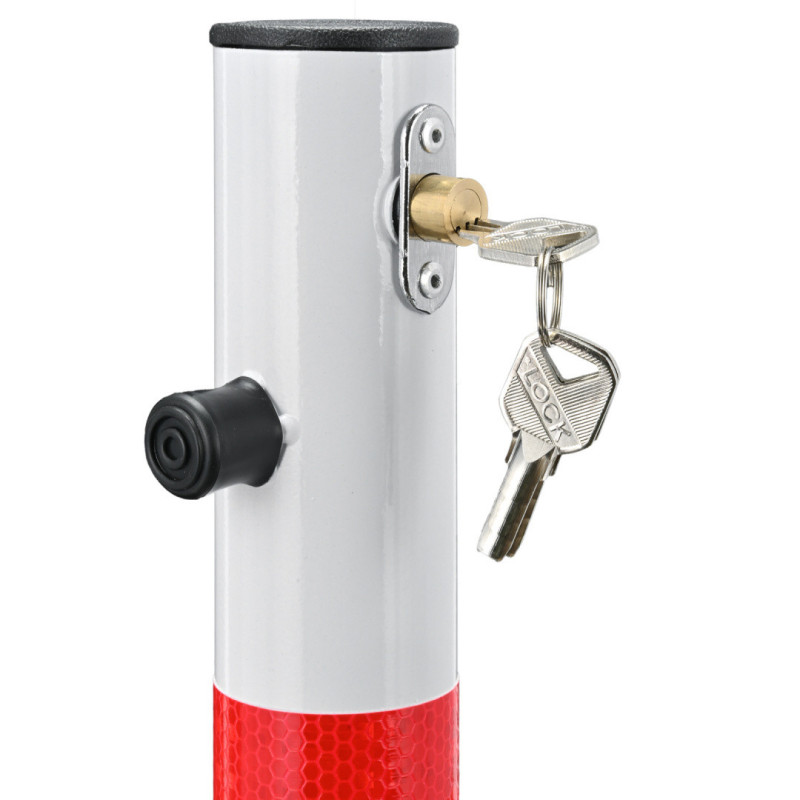 Összecsukható kerek parkolásgátló zárral, maximum 60 cm-es magassággal. A piros csíkok fényvisszaverőek.