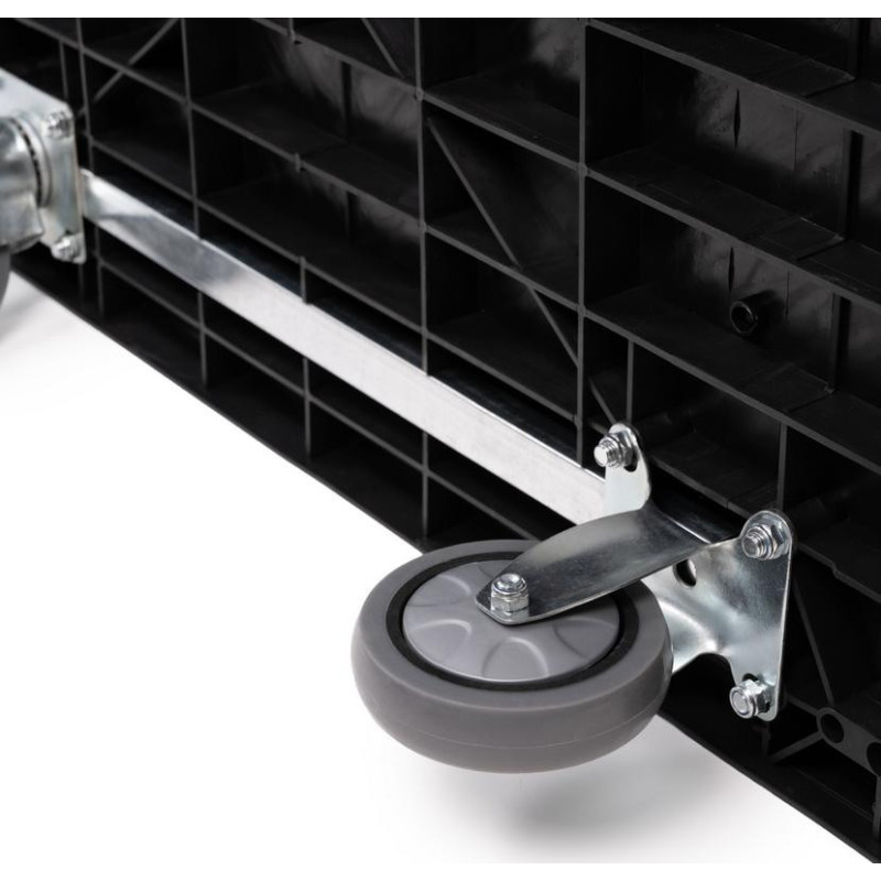 A szerkezet egyenletes súlyelosztást biztosít, megakadályozva a plató meghajlását és a kerekek túlterhelését.