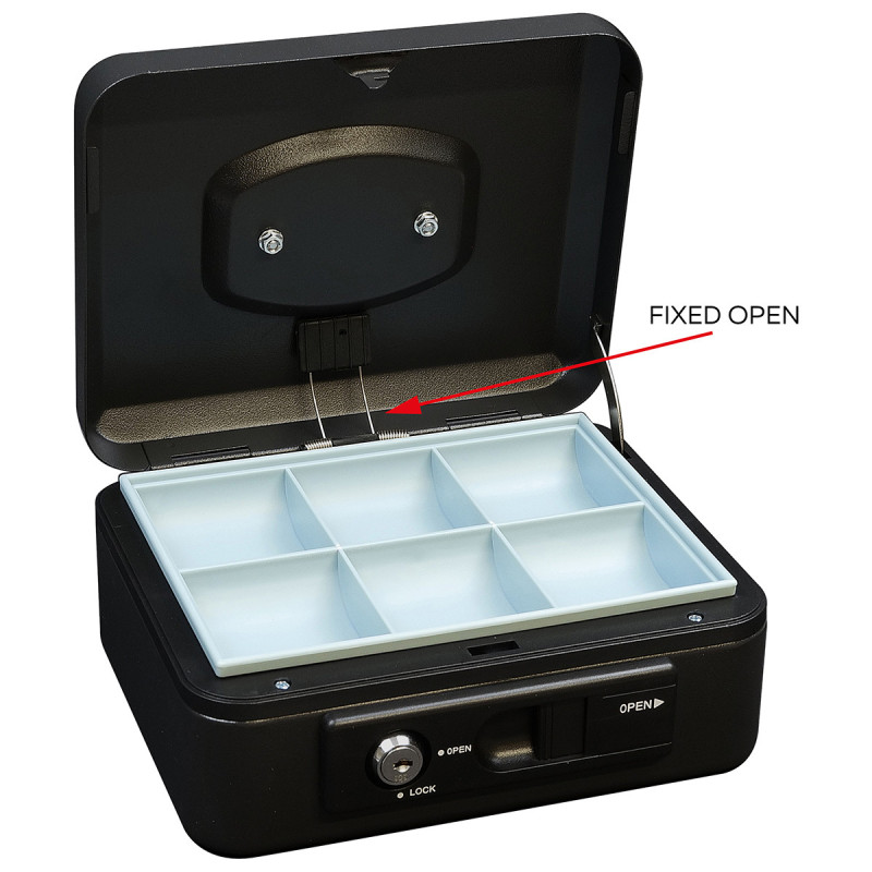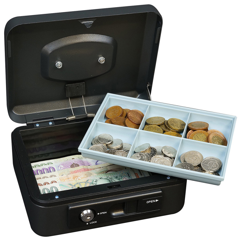 Az acél pénzkazetta külső karral van felszerelve, amely lehetővé teszi a fedél kényelmes, automatikus nyitását. A fedél bezárása után automatikusan reteszelődik, így a kazetta biztonságosan hordozható anélkül, hogy kulccsal kellene lezárni.