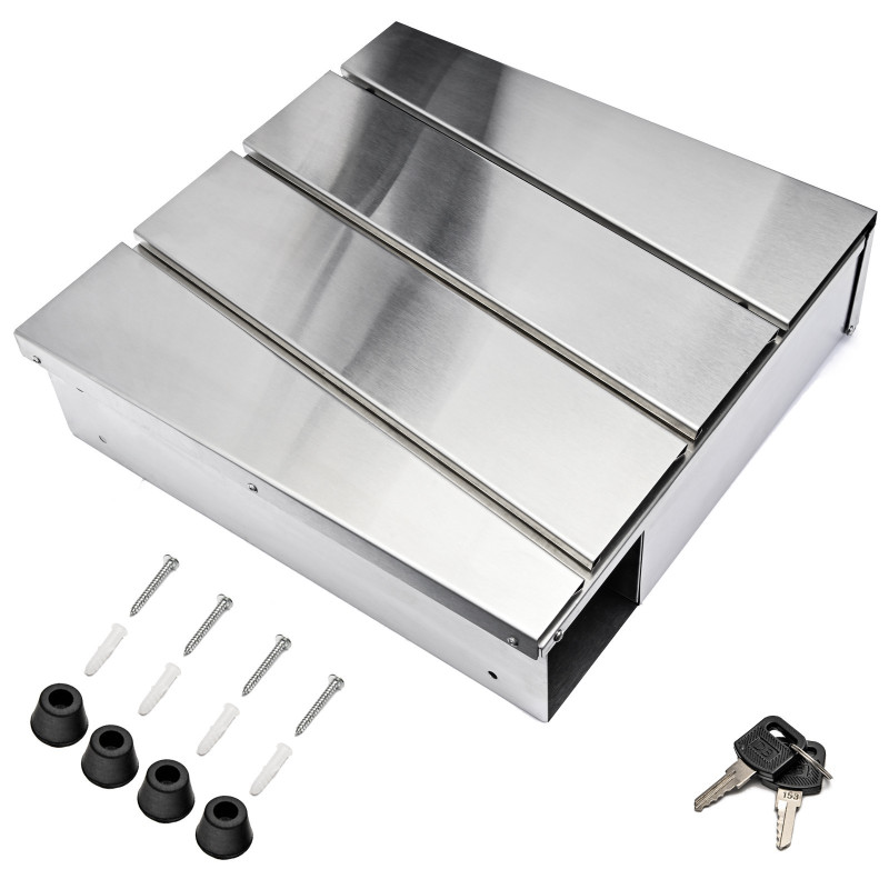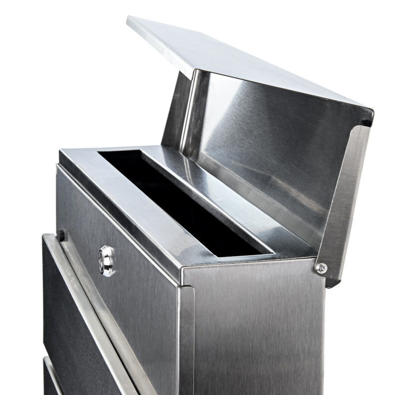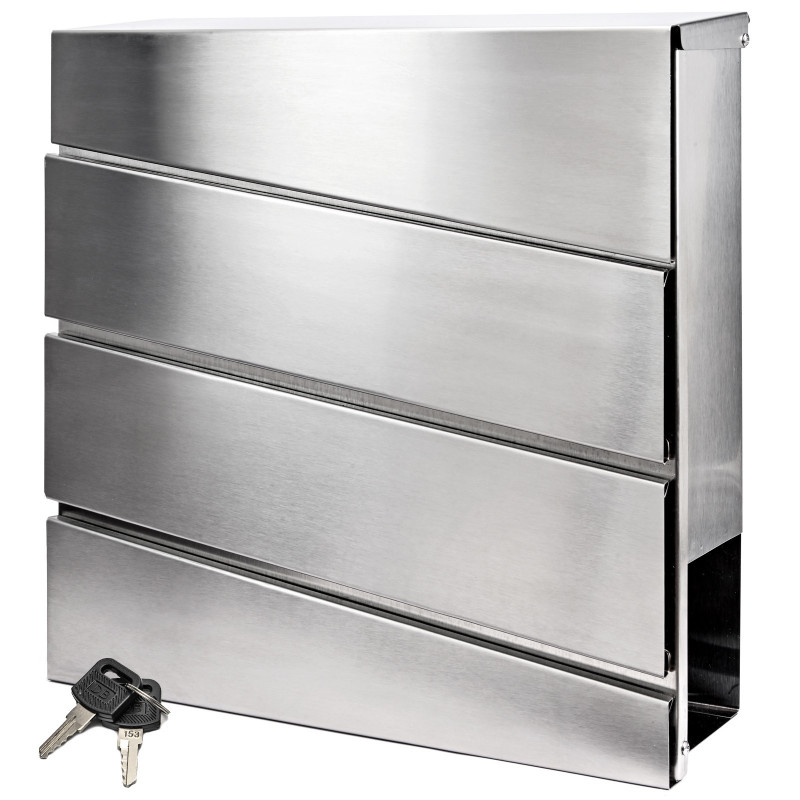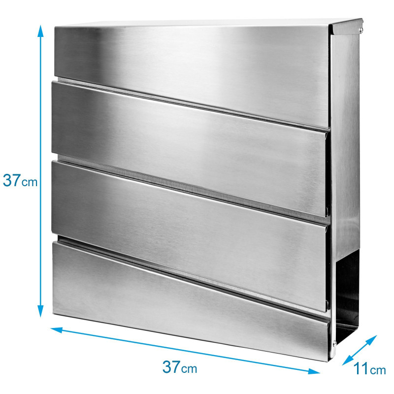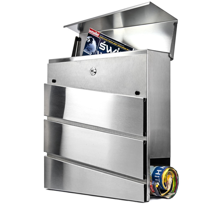 Minőségi rozsdamentes acél postaláda. A felhasznált anyagok biztosítják a hosszú élettartamot és az időjárás állóságot. Kényelmes használatra tervezett modern külsővel. Alsó részén újságtartó rész került, mely be tudja fogadni a nagyobb szórólapokat is. Felülről a küldemények védve vannak az eső és nedvesség ellen. A készlet rögzítőcsavarokat tartalmaz, míg a furatok a doboz hátulján vannak előkészítve - a gyors és egyszerű felszerelés érdekében.
