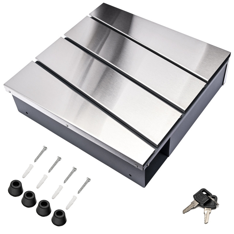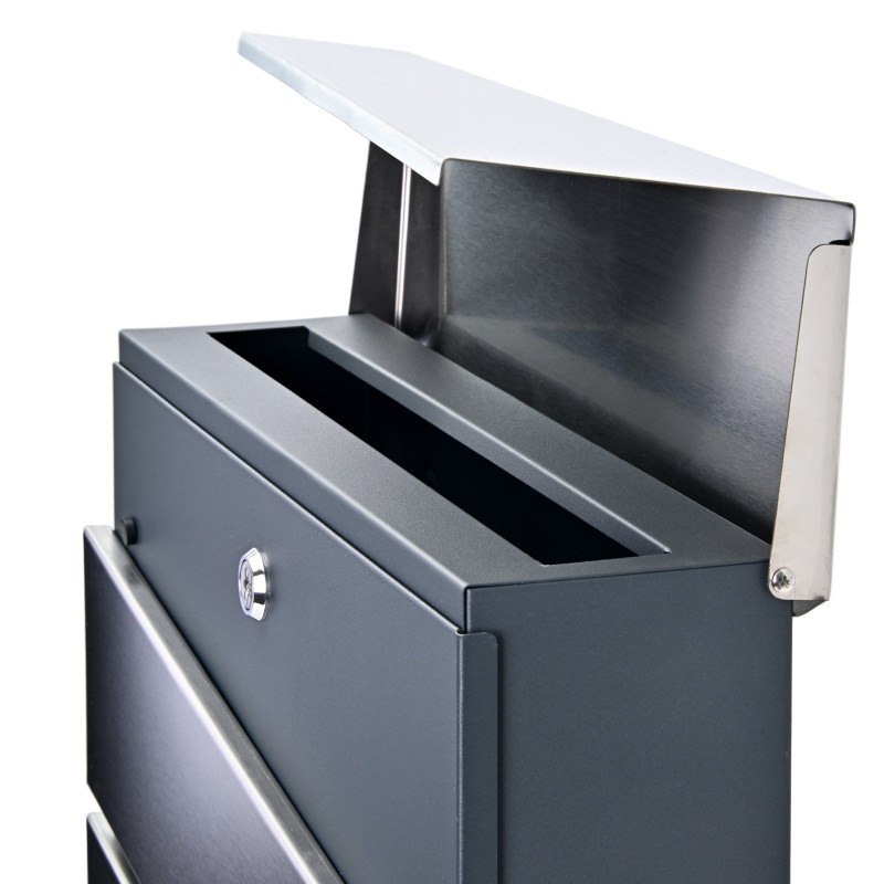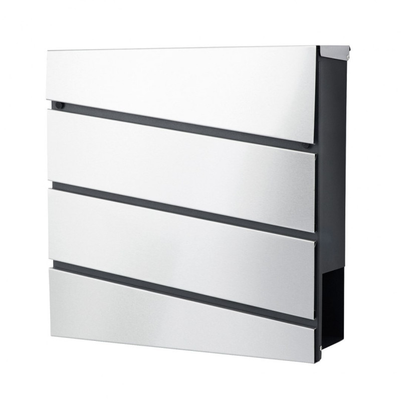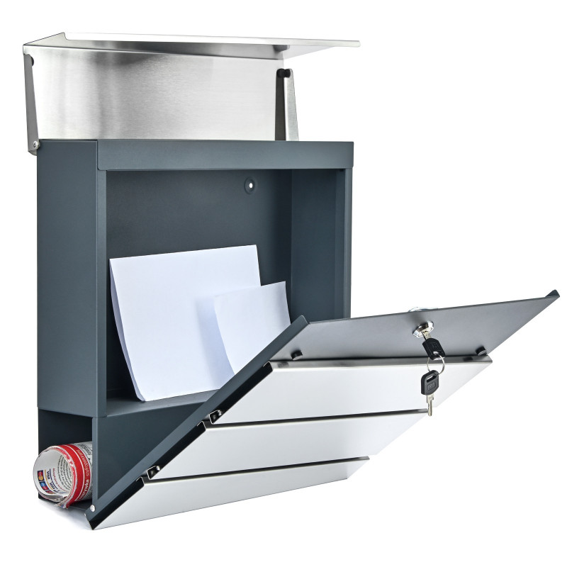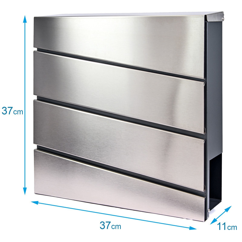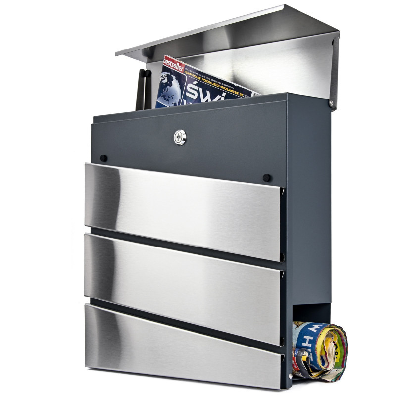 Minőségi rozsdamentes acél postaláda. A felhasznált anyagok biztosítják a hosszú élettartamot és az időjárás állóságot. Kényelmes használatra tervezett modern külsővel. Alsó részén újságtartó rész került, mely be tudja fogadni a nagyobb szórólapokat is. Felülről a küldemények védve vannak az eső és nedvesség ellen. A készlet rögzítőcsavarokat tartalmaz, míg a furatok a doboz hátulján vannak előkészítve - a gyors és egyszerű felszerelés érdekében.