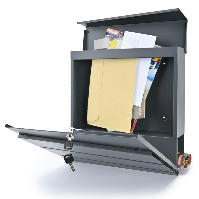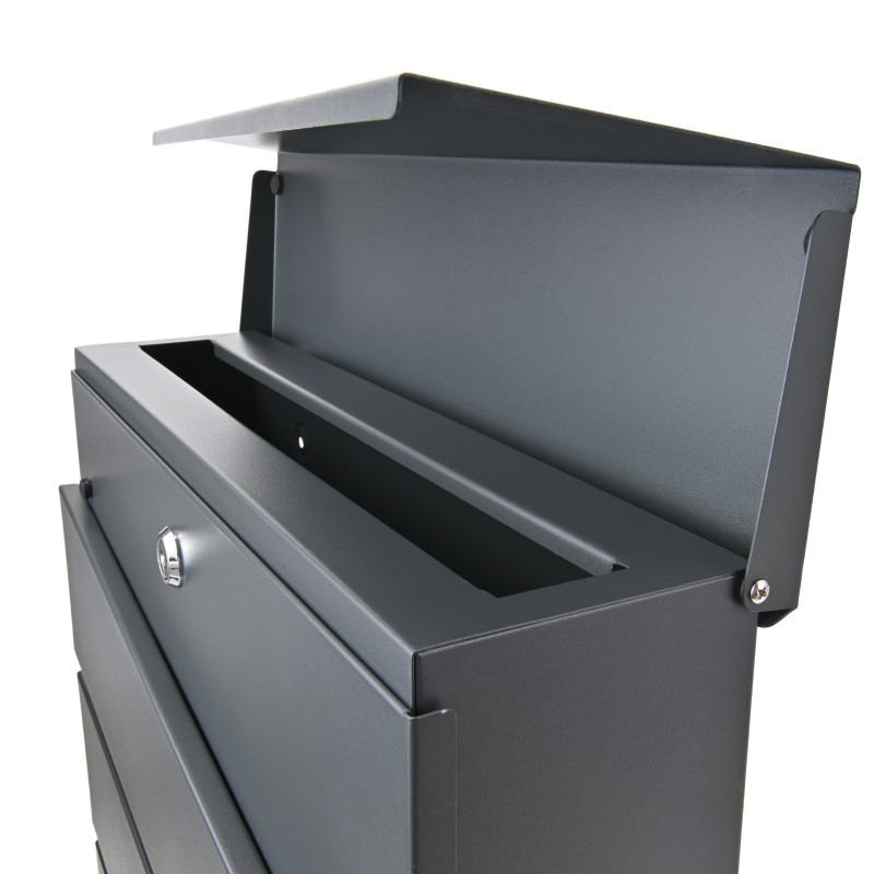 A felhasználó kényelme és az aktuális esztétikai trendek figyelembevételével tervezték. Egy további rekesszel van felszerelve újságok és nagyobb szórólapok számára. A postaláda felső fedele nagyon jól védi a küldeményeket a nedvességtől és az esőtől. A készlet rögzítőcsavarokat tartalmaz, míg a furatok a doboz hátulján vannak előkészítve - a gyors és egyszerű felszerelés érdekében.