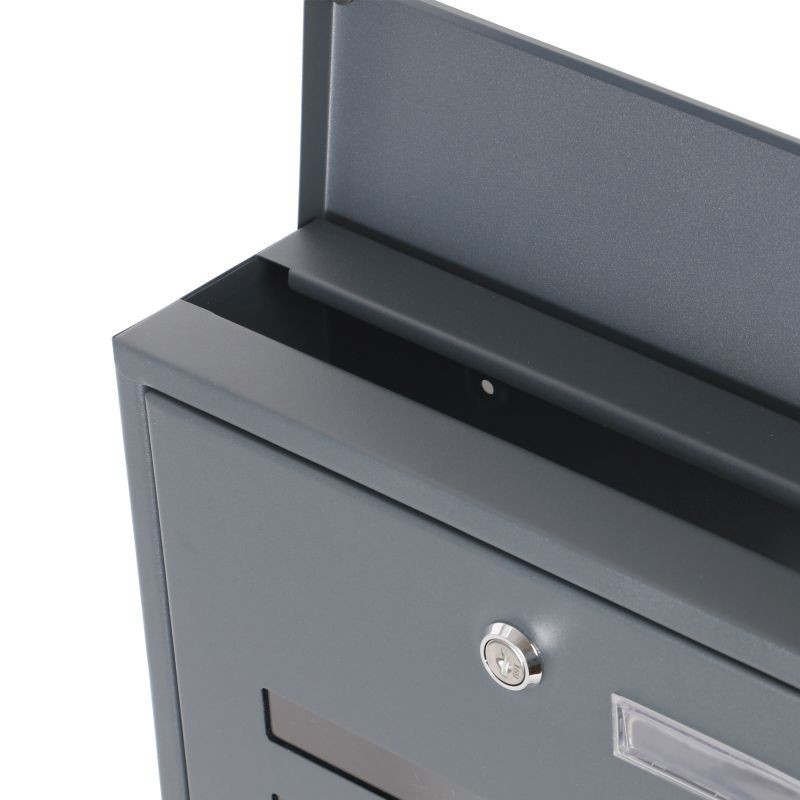 Minőségi acél postaláda antracit színben. Kényelmes betekintést enged a postaláda belsejébe a három hosszúkás ablaknak köszönhetően. Így nem szükséges minden alkalommal kinyitni a postaládát, amikor szeretnénk tudni, hogy érkezett e levelünk. A postaláda újságtartóval is rendelkezik, ahová elhelyezhetőek a szórólapok is.
